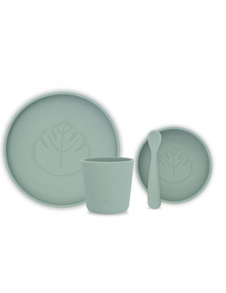 Cet ensemble service pour enfant coloris cert cendre est composé à 100% de silicone alimentaire et se compose d'une assiette, d'un bol, d'une tasse et d'une cuillère. Il y a une ventouse pratique sous la plaque et le bol. Toutes les pièces vont au congélateur, au micro-onde, au four ou au lave vaisselle.