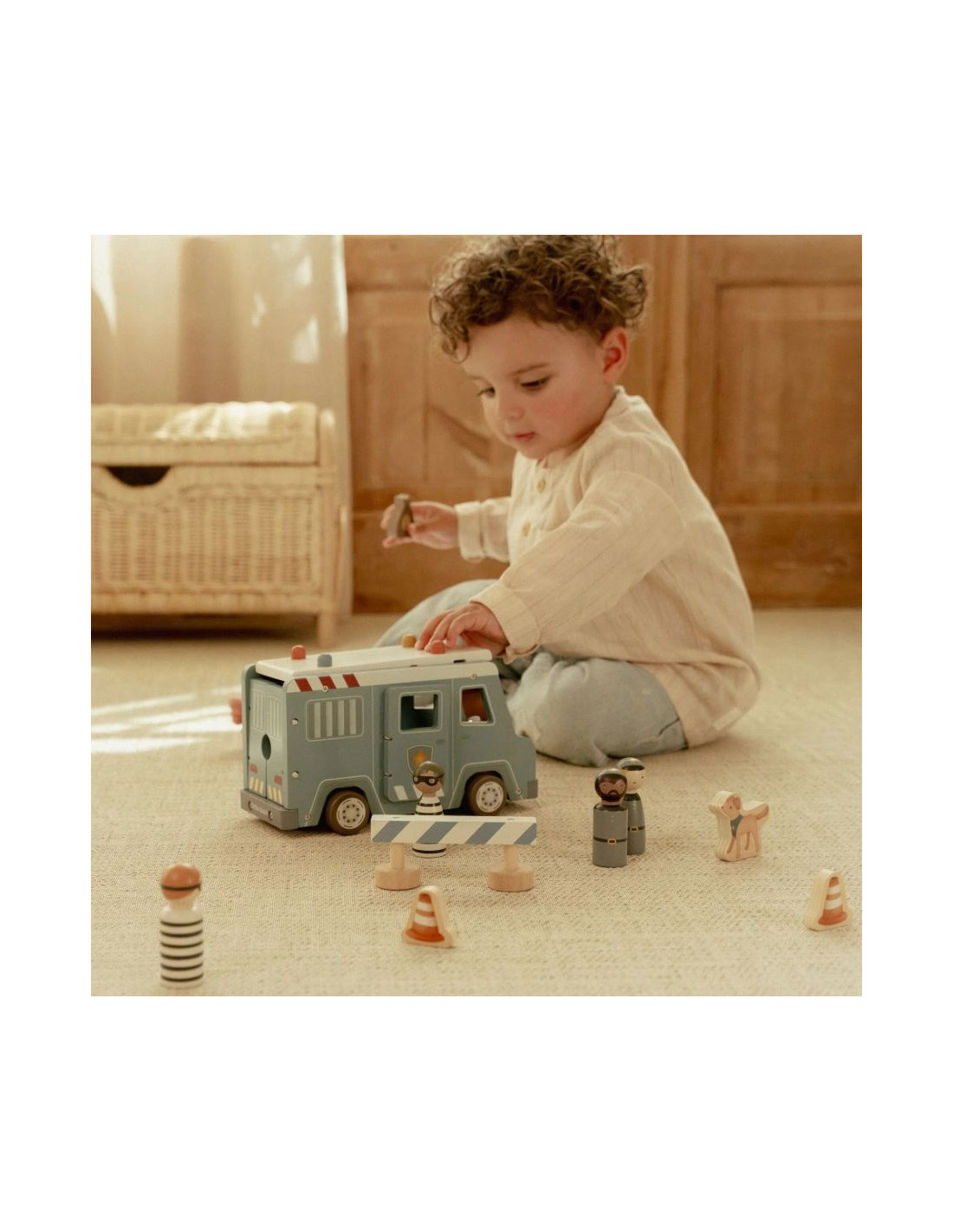 Ce bus de police en bois contient quatre figurines (deux policiers et deux bandits), un chien policier, un sac d'argent, des cônes et une barrière.