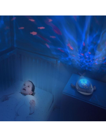 Cette veilleuse musicale avec projecteur lumineux propose 3 intensités lumineuses. Elles permettent de créer l’ambiance parfaite pour aider l'endormissement de votre bébé avec une berceuse, une mélodie marine ou des bruits blancs (vagues, pluie ou battements de cœur intra-utérins). Le volume est réglable. Sons et lumière peuvent être combinés ou utilisés séparément. Elle s’arrête toute seule grâce à son minuteur (musique 15 min – projections 25 min).