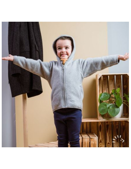 Cette veste à capuche en polaire de laine est donc idéale pour la saison froide. En 100% laine certifiée Gots particulièrement appréciée pour son effet thermorégulateur naturel. La doublure de la capuche est en Interlock 100% coton bio Gots.